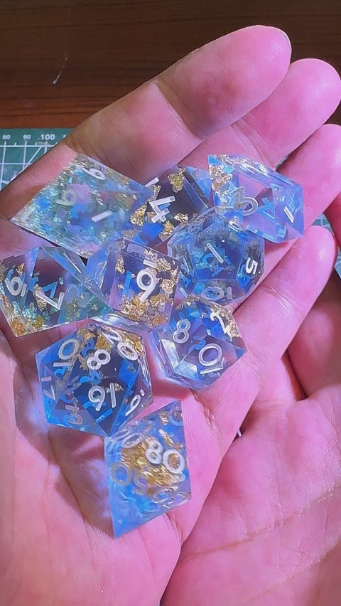 This DND dice set is named "Azure Gold Oath Dice", where every roll shimmers with the liquid radiance of sunlit ocean waves. When your tidecaller paladin swears aquatic vows or your gilded wavesinger bard composes seafoam sonnets, these dice don't fall—they flow, their cerulean cores swirling with molten gold while pearlescent bubbles rise through the resin like ascending treasures. That suspended moment when light fractures through the surface? The Ocean Monarch deciding whether to grant you pearls or shipwrecks.