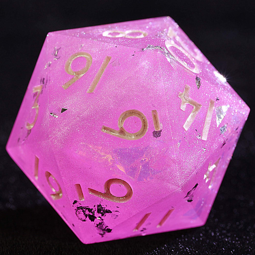 This DND dice set is named *"Pink with Silver Foil Dice"**, where every roll shimmers like a starlit ballet in a crystal ballroom—elegant, ethereal, and touched by lunar grace. When your celestial bard composes sonnets to the moon or your silver-tongued enchanter weaves spells with diamond dust, these dice don’t fall—they waltz, their blush-pink cores glimmering with silver foil that dances like constellations spun from dreams. That breathless moment when the 20 catches the light like a falling star? The Moonlit Muse deciding whether to crown your tale… or let it fade with the dawn.