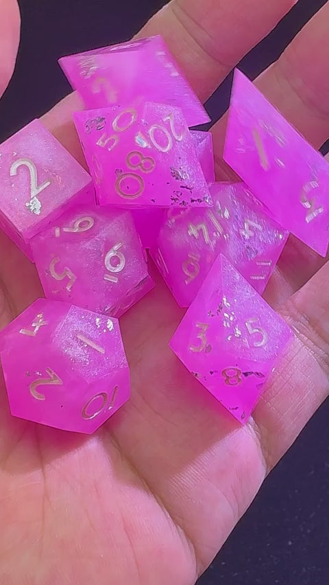 9 Polyhedral Resin DD Set of Dice Pink with Silver Foil