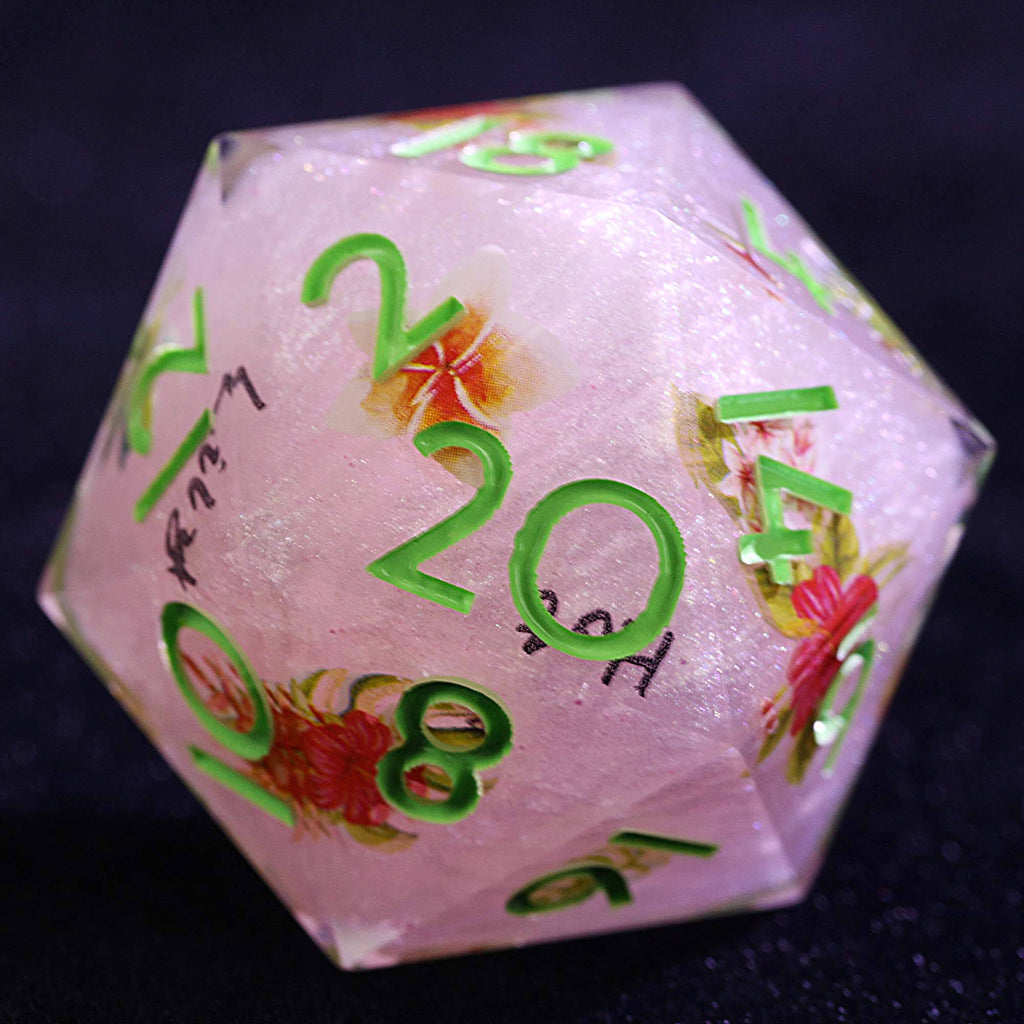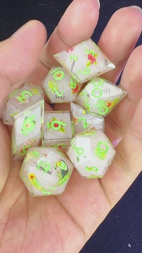9 Polyhedral Resin Dice D&D Sets Pink Sparkly Toucan & Flower