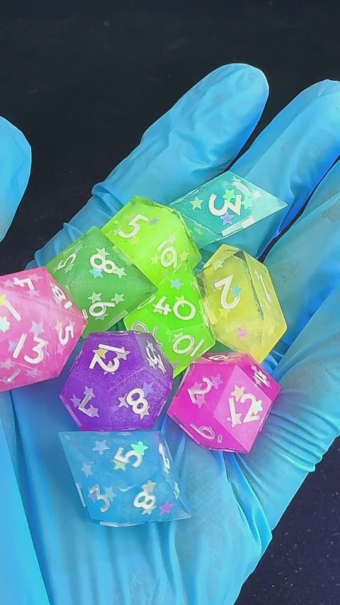 This DND dice set is named "Konpeito Star Candy Dice", where every roll sparkles like a handful of celestial sugar—a galaxy of crystallized joy and rainbow light. When your confectioner wizard crafts spells from spun sugar or your star-child bard sings lullabies to sleeping comets, these dice don’t fall—they glitter, their translucent resin bursting with tiny konpeito-shaped stars in candy-bright hues, each number framed like a window to a sweetshop in the sky. That magical moment when a starry 20 shimmers? The Sugarplum Starweaver deciding whether to grant your sweetest wish… or let it dissolve like fairy floss on the tongue.